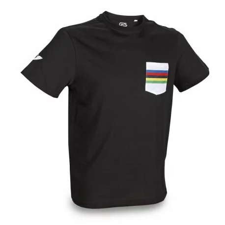 Camiseta de color negro con bolsillo inspirado en el arcoíris del maillot de campeón del mundo.